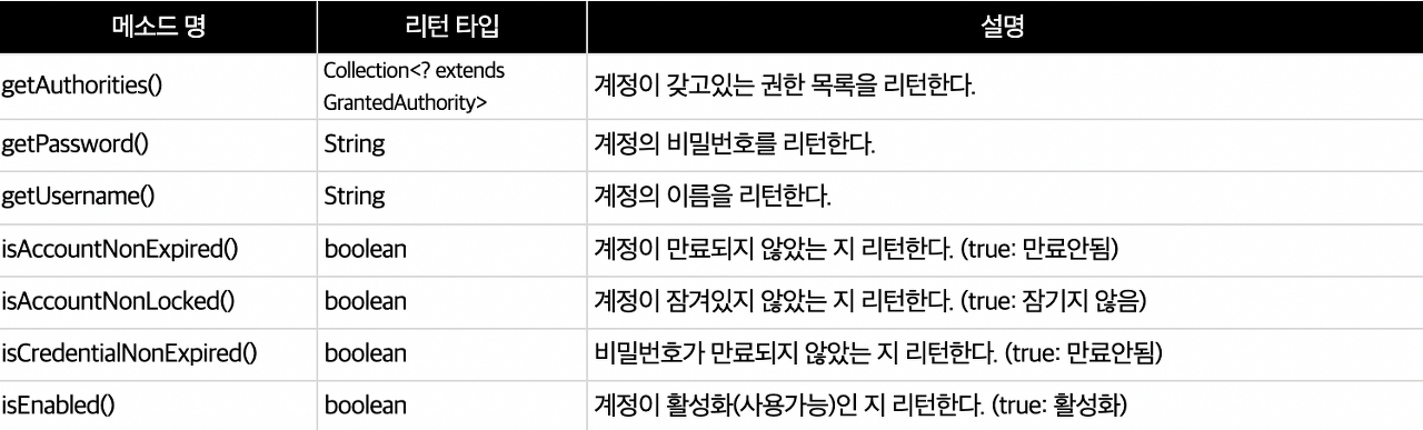 유저객체에서 UserDetails를 상속받게 되면 구현해야할 메서드들이 있으며, 각 메서드들의 정의는 다음과 같다.